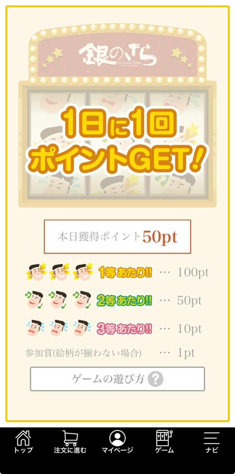このゲームはスロットで1日1回最大100ポイント、参加賞(絵柄が揃わなくても)として1ポイント付与されます。
