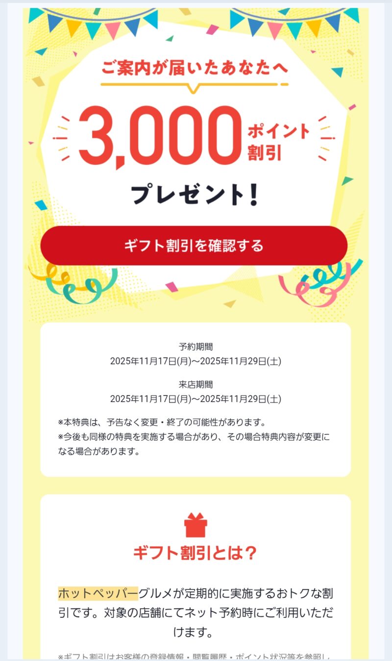 ホットペッパーグルメに登録していると月初と月半ばに「【ご案内が届いたあなたへ】3,000ポイントのギフト割引をプレゼント」というタイトルのメールが届くことがあります。
