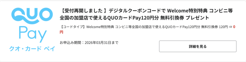 デジタルクーポンコードで Welcome特別特典 コンビニ等全国の加盟店で使えるQUOカードPay120円分 無料引換券 プレゼント